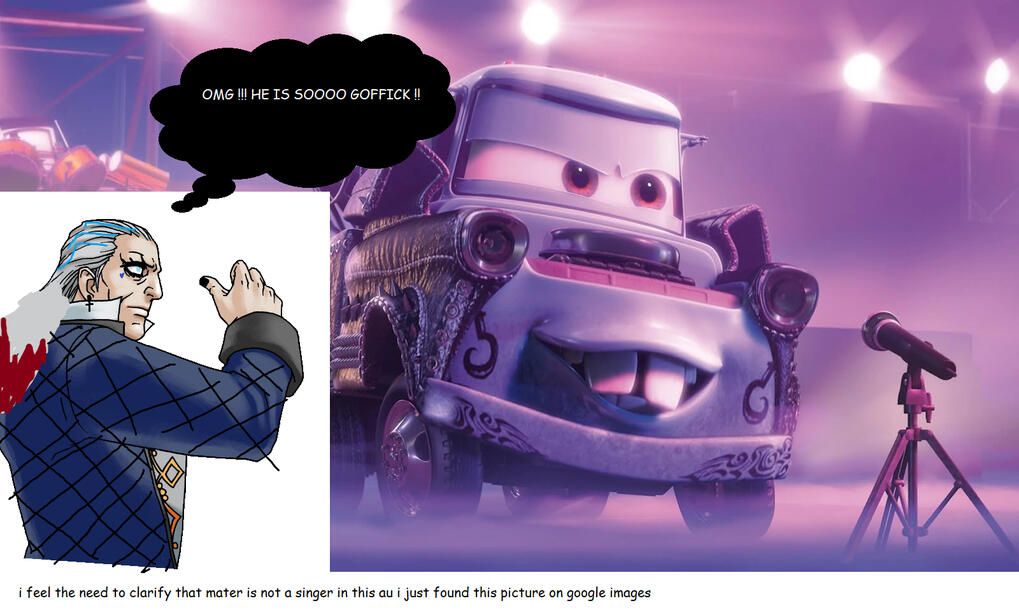 [Image description: a graphic featuring a 'Heavy Metal' Mater, standing on a stage and singing confidently. To the side, Manfred, who has been edited to be goth, is thinking to himself, "OMG! He is sooo goffick!" Text under the image reads, "I feel the need to clarify that Mater is not a singer in this AU. I just found this picture on Google Images. End image description]